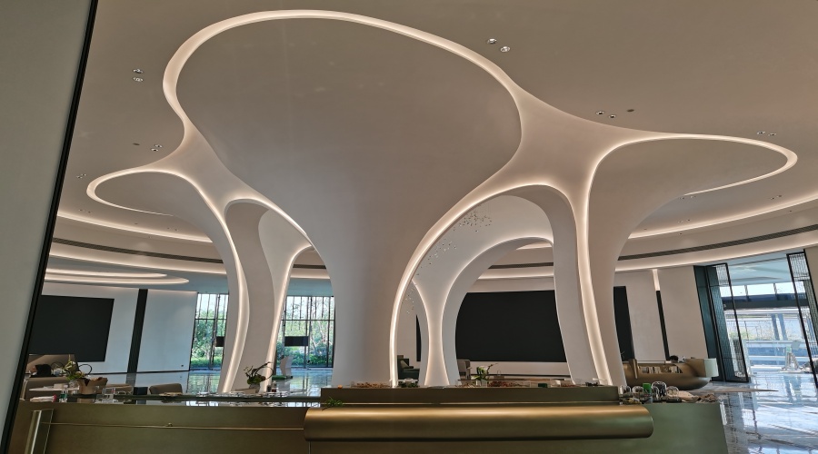 GRG吊頂是飾紀上品的明星產品之一。其造型豐富多樣,可根據設計需求制作成平面、曲面、多曲面、三維覆面等各種形狀,還能實現鏤空花紋、浮雕圖案等藝術造型。例如,在廣州南站地下空間項目中,飾紀上品為其定制的GRG吊頂,不僅造型獨特、美觀大方,還具備良好的吸音性能,有效降低了地下空間的噪音,為旅客營造了一個安靜舒適的候車環境。